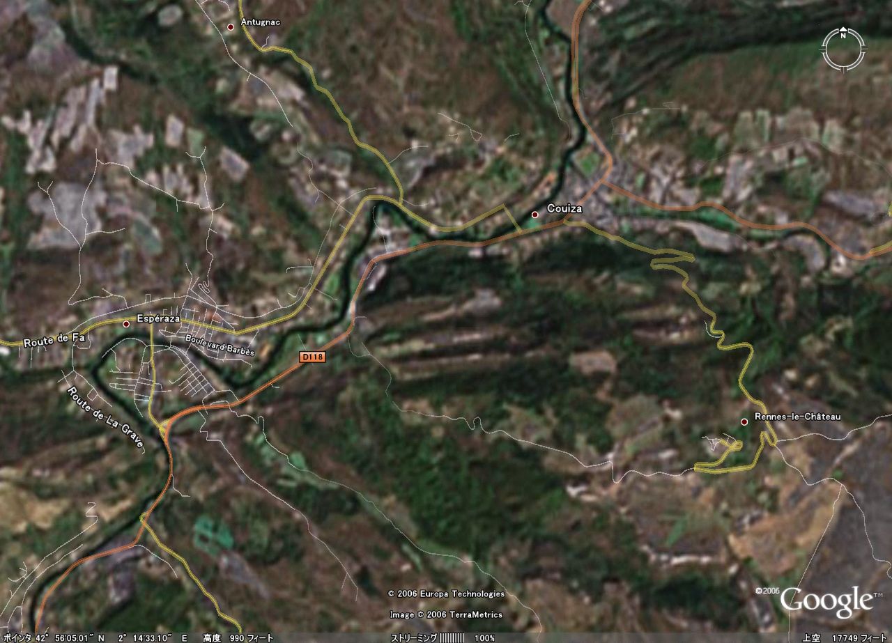 レンヌ・ル・シャトーはカルカソンヌから南へ40キロの場所にあります。QuizaからはSals川を渡り、左手に大きな看板「Rennes-le-Chateau, Son Sites, Ses Mysteres」が見えます。